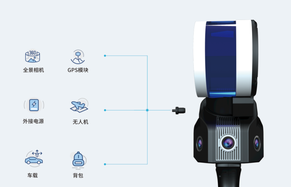 可支持挂载在移动测量平台、飞行平台上,进行空地一体化、室内外一体化数据采集。