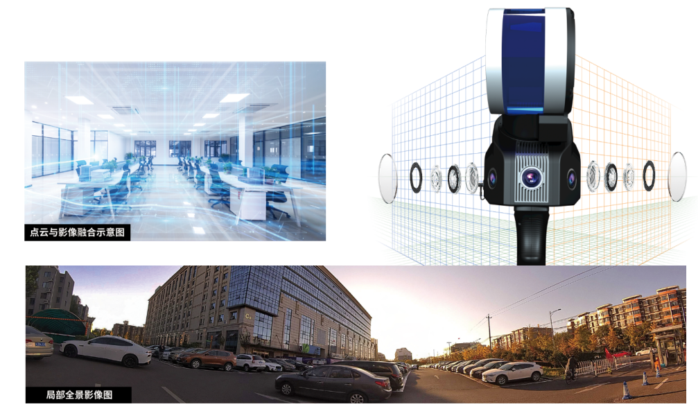 相机方面设备选用三颗500万像素摄像头,形成水平200°、垂直100°视场角,同步获取纹理信息,生成彩色点云和局部全景图。