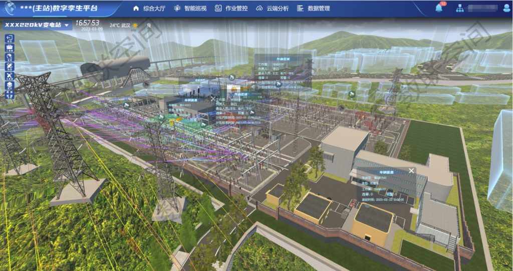 设备规模快速增长对设备智能管控及运行可靠性提出了更高要求,全力打造智慧变电站,在变电站设备状态全面感知的基础上,借助可视化、全景化、智能化技术,将“物理变电站”和“虚拟变电站”融合,以数字孪生的方式进行增值赋能,探索实现变电站三维全息场景的全景监视、运检监控人机智慧协同、故障隐患及缺陷主动识别等功能,提升变电站设备及环境全景实时感知能力,推动提升设备隐患故障定位能力和检修效率,支撑变电专业数字化转型,从而全面实现变电设备精益运维,全面实现无人值班、智能巡视、自动操作、远程许可、云端分析的数字化运维管理体系,建设变电站综合数字孪生平台。