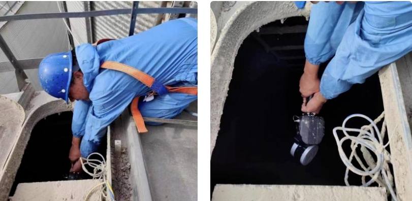 SLAM100最大测距(120m)可覆盖罐体底部到顶部的最大距离(约22m),扫描人员在罐体顶部即可获取罐体内部全貌点云。SLAM100的扫描过程(开机、初始化、扫描、关机)均在罐体外部进行。一个罐体扫描耗时约5分钟,共扫描3个罐体。