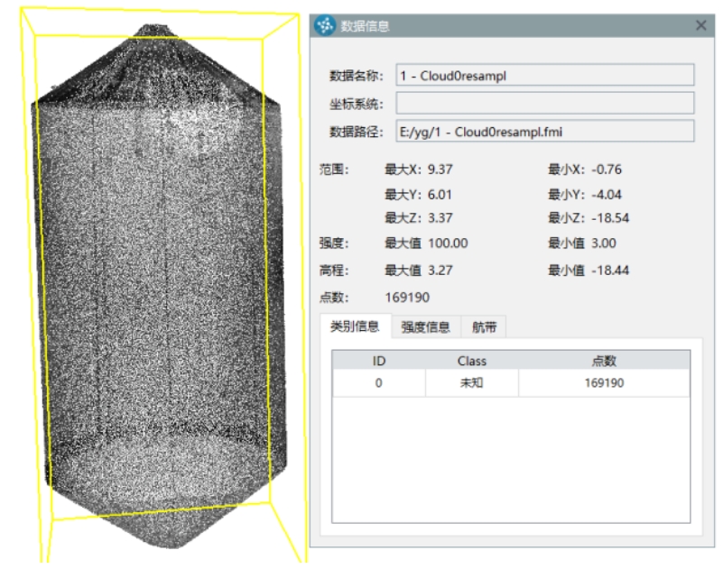 为提高罐体模型后续处理效果,加快模型优化速度,可在保证点云特征形态完整的前提下对点云进行精简。通过对比分析三种常见采样方法的效果(空间距离抽稀、体素抽稀、随机抽稀),选择空间距离采样方法精简点云,经过多次参数调试,最终确定采样距离为0.05m。原始点云数据包含626,6854个点,采样后点云数据包含169,190个点。